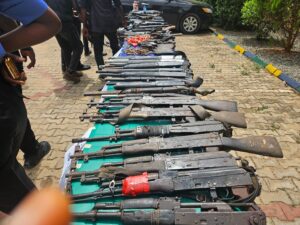 2. ARREST OF A SUSPECTED GUN RUNNER AND RECOVERY OF THREE (3) AK-47 RIFLES THREE THOUSAND, ONE HUNDRED AND TWENTY (3,120) ROUNDS OF AMMUNITION: On 3/03/2025 at about 1200hrs operatives of the command attached to Dragon 14 while on stop and search duty along Warri/Benin road by Western Delta University Oghara intercepted a blue colour Toyota Camry with Reg No PHC-257-NT driven by one, Peter James (m) aged 55yrs indigene of Uyo, Akwa Ibom State. The driver was asked to open the trunk of the vehicle, during which it was observed that the trunk of the said Camry, popularly known as “big daddy,” was unusually small. This aroused the suspicion of the policemen that the vehicle had been modified for malicious purposes. The Policemen then proceeded and removed the seat of the vehicle, only to discover three (3) AK-47 rifles, Two Thousand and Eighty (2,080) rounds of 7.62mm ammunition, one thousand and forty (1,040) rounds of 51mm LAR ammunition totalling three thousand, one hundred and twenty rounds of ammunitions loaded in six boxes. The exhibit has been recovered, and the investigation is ongoing.