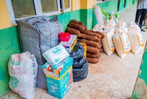 Items donated by Dame Okowa and O5 Initiative to the four camps include, bags of rice, garri, beans, tubers of yam, palm oil plates, diapers and bags of soap.