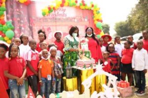 Wife of the Governor of Delta, Dame Edith Okowa in a photograph with the children and the Christmas Party cake.