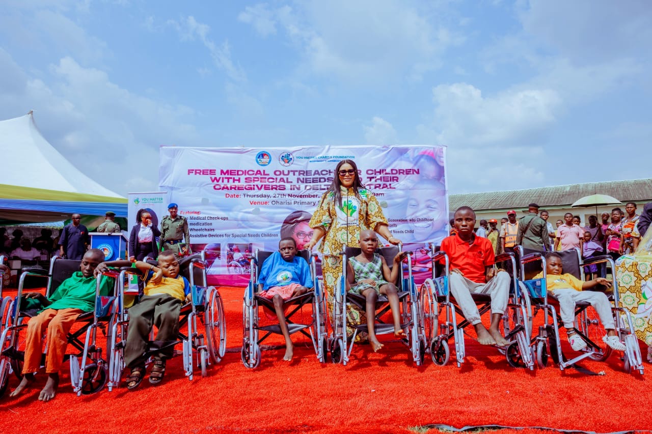 The Wife of the Delta State Governor and Founder of the You Matter Charity Foundation, Her Excellency Deaconess Tobore Oborevwori, on Thursday, November 27, 2025, launched a free medical outreach for children with special needs and their caregivers in Ughelli, Delta Central, donating medication, wheelchairs, and a variety of assistive and educational devices.