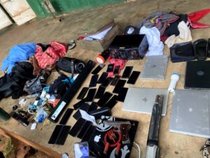 Items recovered from the suspects included one pump action rifle with one live cartridge, one Beretta pistol with six live rounds, three assault rifle rounds, a Daylong motorcycle with registration number SAP 369 VK, a Qlink motorcycle with registration number URM 750 QV, twenty-five mobile phones, four laptops, a tablet phone, a PS4 console, a home theatre set, two Zealot music players, bags of clothes, and other stolen goods. Several victims have since identified their property.
