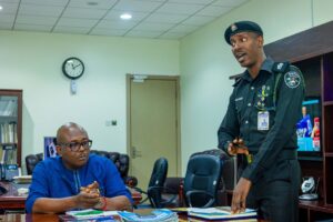 Delta State PPRO, SP Bright Edafe briefing Dr. Osuoza, Commissioner for Information on why he came to visit him.