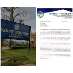 The letter , titled RE: SUSPENSION OF THE RECTOR OF DELTA STATE POLYTECHNIC , OGWASHI-UKU, reads in part : “While the Ministry appreciates the Council,s commitment to upholding discipline and accountability in the Polytechnic, it is imperative to underscore that all disciplinary actions , especially those affecting Principal officers of the Polytechnic , must comply with relevant provisions of the law establishing the Polytechnic , as well as the Terms and Conditions of Service applicable to Principal officers. Specifically , the attention of the Council is drawn towards the following statutory provisions : Part 1V, Section 17 (1) , of the law establishing the Polytechnic which states , “The Chairman of Council shall in relation to the Polytechnic , take precedence over all members of the Polytechnic , EXCEPT the Visitor and the Rector, except when acting as Chairman of the Congregation or Convocation , or in the course of performing his academic and executive functions”