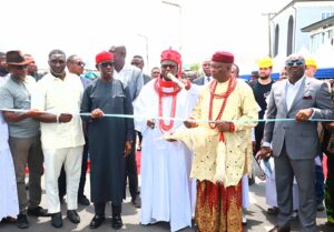 Delta Governor, Senator Dr. Ifeanyi Okowa (3rd left), holding the tape to support His Royal Majesty, Dr. Emmanuel Sideso Abe I, Ovie Uvwie (middle) as he cuts it to Inaugurate the widened Warri/Sapele Road from Effurun Roundabout to Enerhen Junction on Wednesday. With them is Ogurimerime Ukori I, Ovie of Agbon (2nd right); Secretary to State Government, Chief Patrick Ukah (right); Commissioner for Works (Highways and Urban Roads), Mr Noel Omodon (left); Chairman, Uvwie Local Government Area, Mr Ramson Onoyake (2nd left) and others. PHOTO: SAMUEL JIBUNOR