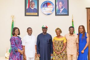 L – R. The wife of Delta Governor, Dame Edith Okowa, Senator Dr Ifeanyi Okowa (2nd left), Edo Governor, Mr. Godwin Obaseki and wife Betsy(middle), his deputy Philip Shaibu and wife, Maryann(right) during a thank you visit by the Edo State Governor to Senator Ifeanyi Okowa in Asaba.