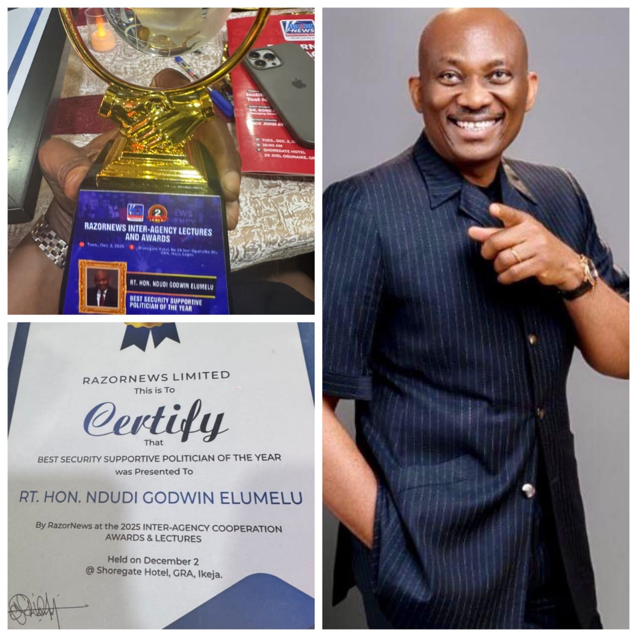 Former Minority Leader of the House of Representatives, Rt. Hon. Ndudi Elumelu, has been honoured with the “Best Security Supportive Politician of the Year” award at the maiden edition of the RazorNews Inter-Agency Cooperation Awards.