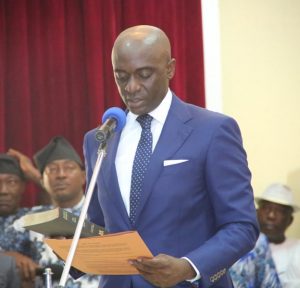 Mr. Chiedu Ebie taking the oath of office as the new Delta State SSG.