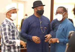 Delta Governor, Senator (Dr) Ifeanyi Okowa (right), Director General, NIMASA Dr. Bashir Jamoh (left), and the Executive Director Cabotage and Maritime Labour Services, Engr. Victor Ochei, during a courtesy call by the Management of NIMASA led by the DG on the Governor in Asaba. Thursday 4/3/21. PHOTOS: BRIPIN ENARUSAI