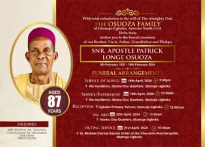 The Osuoza family of Idumuje-Ugboko, Aniocha North LGA in Delta State, has released the dates for the funeral ceremony of their Late Patriarch, Diokpa Patrick Longe Osuoza, father of the Delta State Commissioner for Information, Dr. Ifeanyi Osuoza.