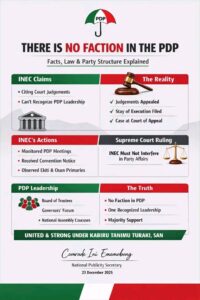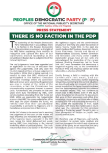 The leadership of the Peoples Democratic Party reiterates that in law and fact, there is no faction in the Peoples Democratic Party. This reiteration is necessary in the light of the INEC letter explaining their inability to recognise and upload the data of our legitimately elected leadership at the convention in Ibadan due to judgements of the Federal High Court.