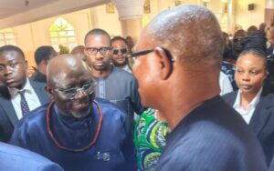 Delta State Govermor Sheriff Oborevwori, left exchanged pleasantries with Mr. Peter Obi at the funeral mass for Senator Nwaoboshi.