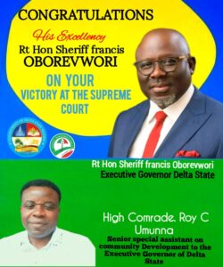 The Senior Special Assistant on Community Development to the Governor of Delta State, High Comrade Roy Umunna has congratulated Governor Sheriff Oborevwori on his hard fought and hard won victory at the Supreme Court.