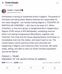 Trump announced that he is designating Nigeria a “Country of Particular Concern,” a classification used under U.S. law for nations accused of severe violations of religious freedom. Although largely symbolic in the immediate term, the designation typically precedes potential sanctions or diplomatic pressure.