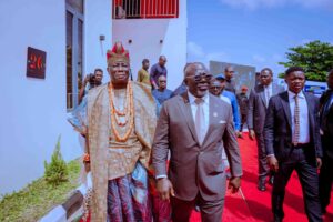 Governor Oborevwori (right), and the Asagba of Asaba, Prof. Epiphany Azinge, SAN, taking a tour of the newly Commissioned 8 Units of 4-Bedroom Duplexes built by the Governor Sheriff Oborevwori’s administration in commemoration of his two years anniversary at Asaba on Monday. Photos: Samuel Jibunor