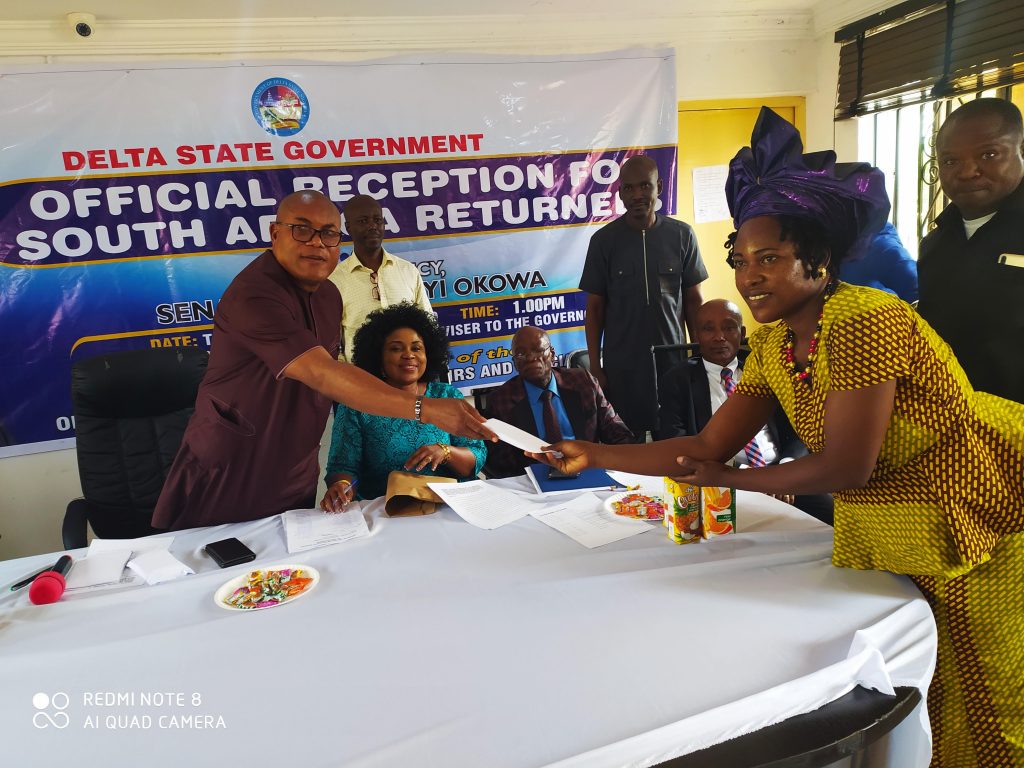 The Senior Political Adviser to the Governor of Delta state, Rt Hon. Funkekeme Solomon makes a presentation to one of the Soth African returnees.Photos: Austine Oyibode. The Senior Political Adviser with Genevieve Mordi, Special Assistant…